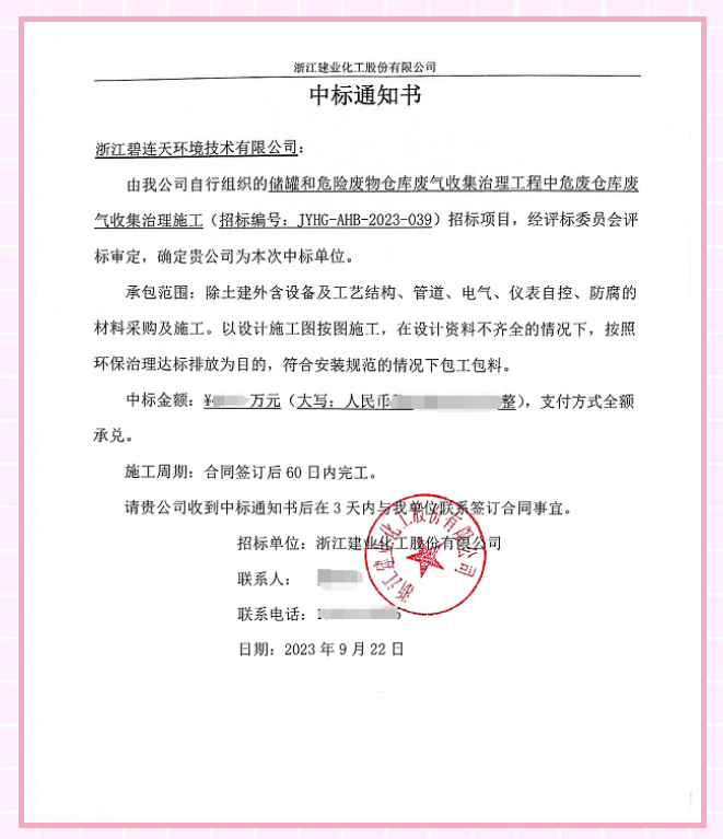 近日,我司凭借多年的环保技术积累和丰富的项目经验,在激烈的竞争中脱颖而出,成功中标浙江建业化工股份有限公司储罐和危废库废气收集治理工程项目!这是我司又一次赢得老顾客浙江建业化工股份有限公司的信任和认可。