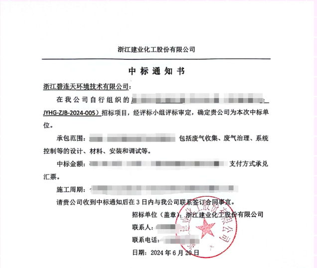 近日,我司凭借多年的环保技术积累和丰富的项目经验,在激烈的竞争中脱颖而出,成功中标浙江建业化工股份有限公司某废气收集治理工程项目!这是我司又一次赢得老顾客浙江建业化工股份有限公司的信任和认可。