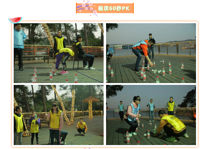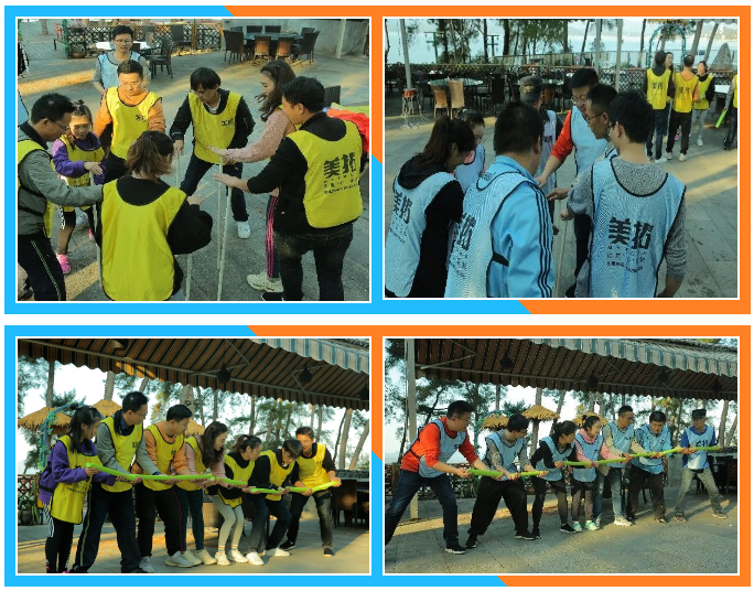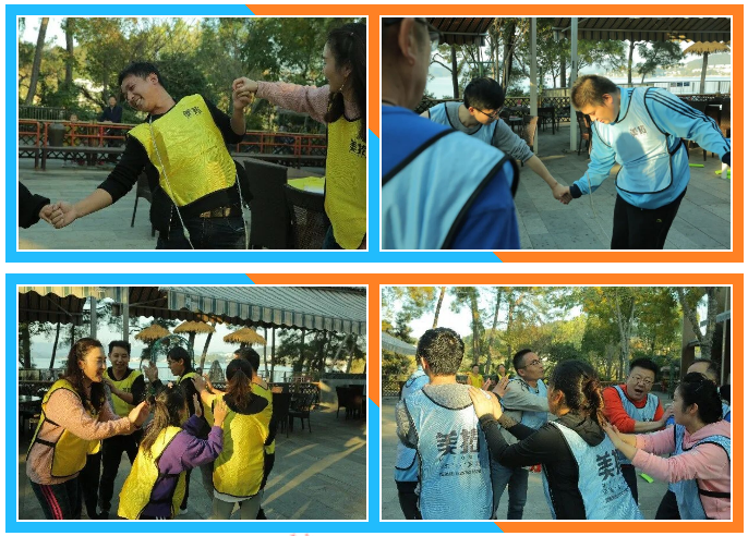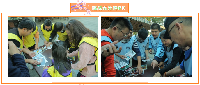 经过短暂热身活动之后,大家经过自由组合分成了蓝黄两队,并群策群力确定了各自队伍队名、队长、队徽、口号。训练活动以竞技PK的方式进行,PK之前两支队伍都激情澎湃,斗志昂扬,齐声高喊着各自的团队口号,展示了舍我其谁的霸气。PK比赛项目三个:第一个是挑战五分钟;第二个叫极速60秒;第三个叫排兵布阵。