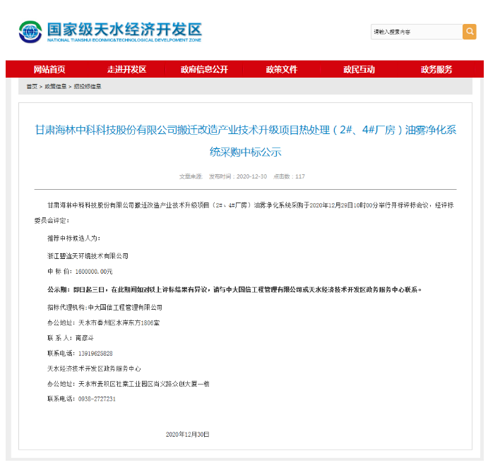 辞旧迎新之际,公司有机废气事业部传来捷报,从国家级天水经济开发区网站获悉,我司成功中标甘肃海林中科科技股份有限公司搬迁改造产业技术升级项目热处理油雾净化系统采购。有机废气事业部为公司今年画上一个圆满的句号,为明年的发展打下了良好基础。